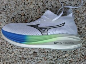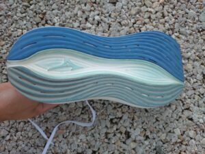 これまでのミズノのイメージを覆すほどミッドソールが柔らかいです。ニューバランスのFuelcellフォームに近い柔らかさで適度な沈み込みと反発弾性が感じられます。また、プレート非搭載のため足裏の屈曲性が高くニューバランスの「Fuelcell rebel」に近い感覚でした。