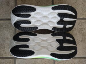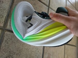 また、前足部にかけて柔らかく(沈み込みが大きく)なっているのですが、どこから接地してもミッドソールが変形しながら重心を前に送ってくれる感覚で、柔らかさに対して脚離れがスムーズでした。